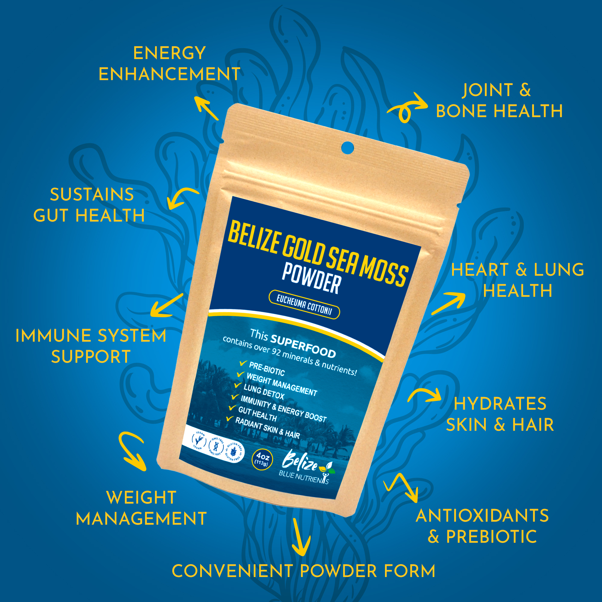We’re proud to announce that our premium Eucheuma cottonii — sustainably grown in the clean coastal waters near Belize’s UNESCO-protected reef — is now available in a convenient powder form.